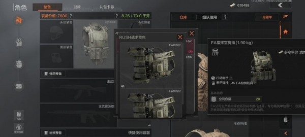 准备物品:老式行军包、牛皮背包、RUSH包、926轻量级(均可在文森特购买)、FFA指挥官两个。 (有点贵,可以用FA战术代替,但是格子会少一些)