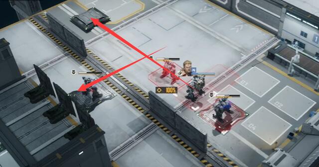 2.控制第二格角色移动至右上角,将机甲推至最上方,前往第三格将剩余机甲吸引回原位,结束本回合。