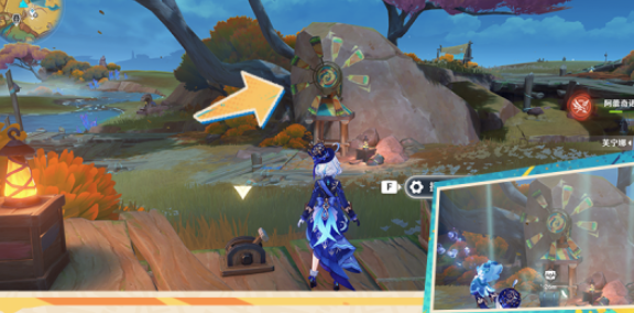 12.然后按照提示到彩石屋顶西侧,操作水池边风车前的杠杆。