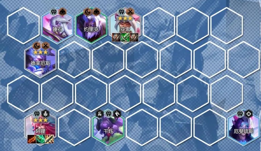人口达到7后,添加约里克,开2个天空守卫和2个野游羁绊,增强锤石的双重抗性和阵容中大部分棋子的护盾(记得站在野游格子上)。