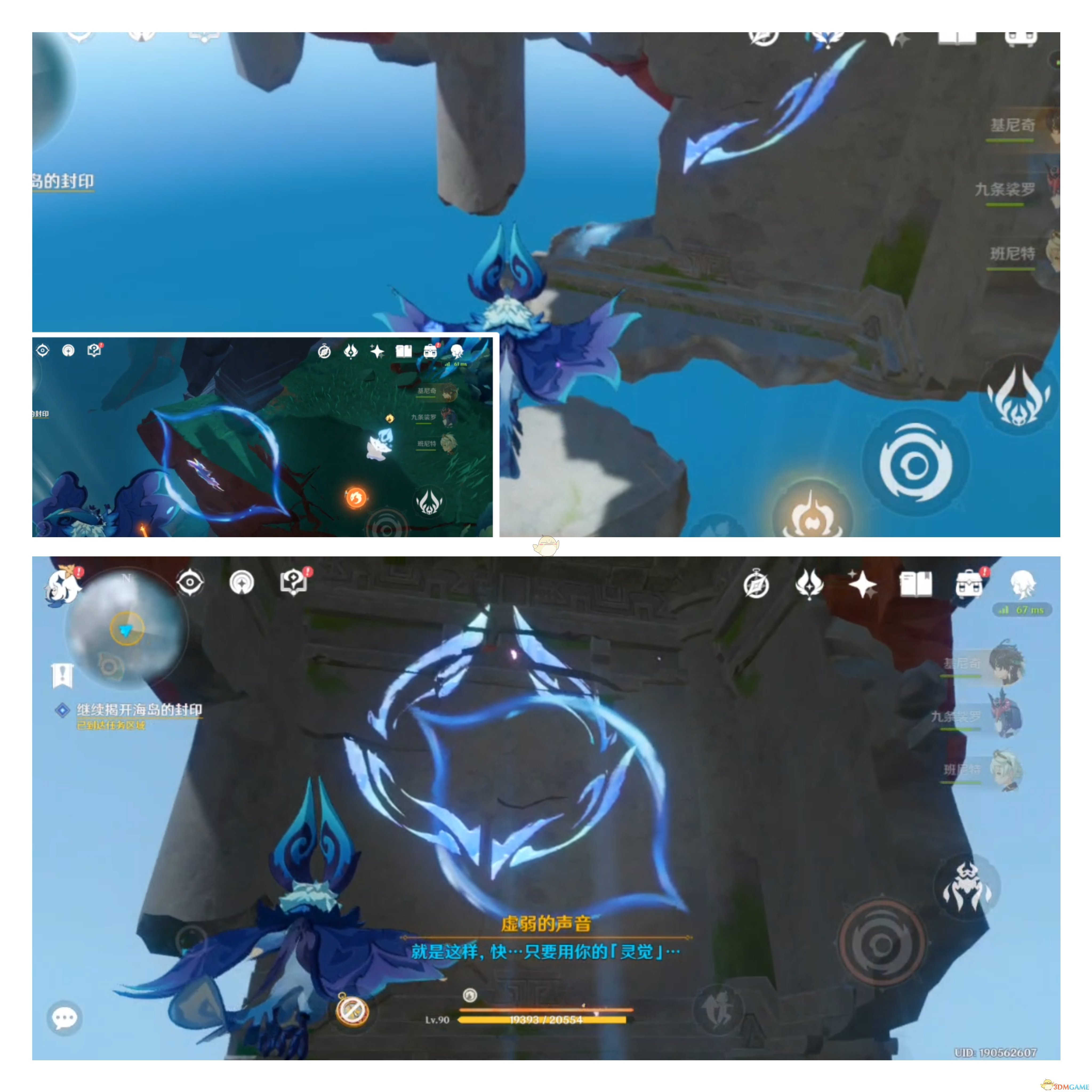 7.空中有一条凝视龙引导着浮岛。按住右下角的普攻即可获得剩余的石头。你可以看到浮岛底部的涂鸦。安装好石头后,按住普攻进入灵识,释放第三块石头。海豹。