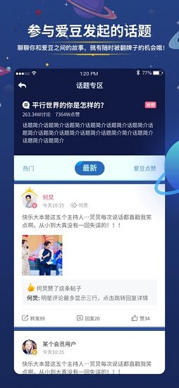 4.快乐星球是专门为偶像化用户开发的互动软件。在快乐星球,您可以在线进行偶像崇拜。同时快乐星球在明星互动方面还是很有意思的。如果你想偶像化,你不妨下载快乐星球并使用它。