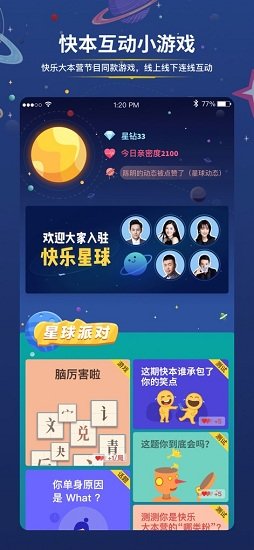 3.快乐星球是一个可以和快乐大本营的明星在线互动的平台。快乐星球专为快乐大本营忠实粉丝打造。可以在快乐星球了解最新一期快书的嘉宾,与明星互动。