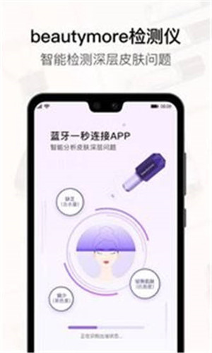 --硬件检测,便捷精准:美图美妆*新研发的beautymore皮肤检测仪搭载美图美妆APP,蓝牙一秒连接,轻松检测敏感度、黑色素、含水量、油脂、抗衰度等深层次皮肤问题,开启智能美肤之旅。