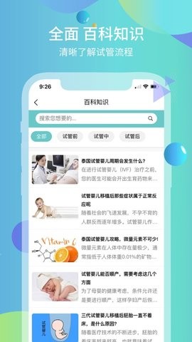 2.体外百科知识:包括试管前、中、后的知识,帮助用户清晰了解试管婴儿的全过程,解决试管婴儿过程中的疑惑。