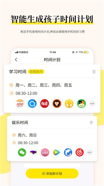 可设置多个时间计划,覆盖孩子一天的使用手机的场景。