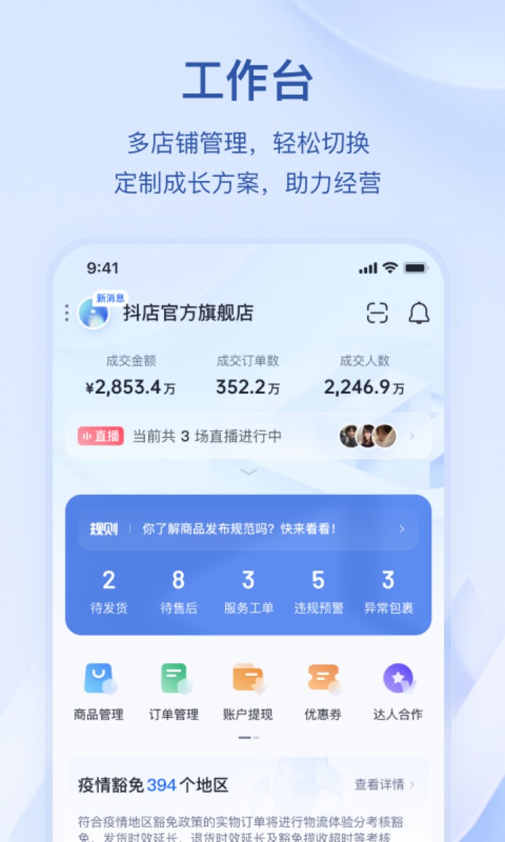 抖店app是专门为抖音电商出品的店铺管理软件。在这个APP:抖店中,您可以轻松管理自己的抖音店铺,强大的AI能力可以为商家提供数据。分析,为商家提供有效的信息,为商家吸引客流量,而这个:抖店应用程序可以直接与商店连接,方便商家在手机上管理产品,让您少走弯路,减少摸索成本。您还可以在该软件中直接与买家沟通,转换订单费率。可以说,这个:抖店app是抖音商家必备的手机软件之一。错过了,快来试试吧。