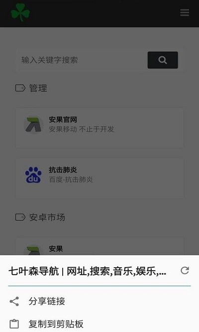 是一个基于WebView的简单浏览器,安果浏览器app可以自行切换搜索引擎;