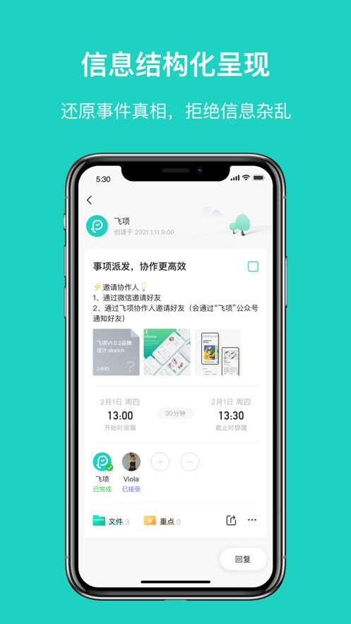 1.支持多端同步,让你把玩大大小小的事情,把每件事情都做的漂亮,分享细节,一键生成事件报告,开启即时了解模式。