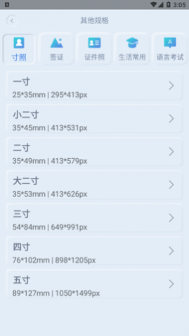 4.软件有很多证件照规格,用户可以选择自己需要制作的。