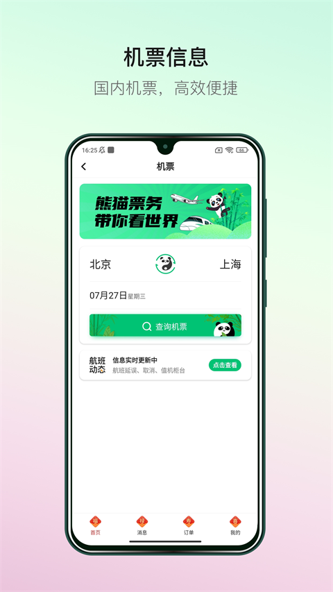 熊猫票务app提供一站式预订和询问机票,火车票和酒店。用户可以通过一个平台满足所有旅行需求!根本不需要在不同的应用程序或网站之间切换,这极大地简化了旅行计划的制定和执行!