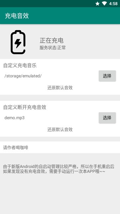 2。安装后打开此软件,单击自定义充电音乐或自定义断开连接:在充电音效之后选择;