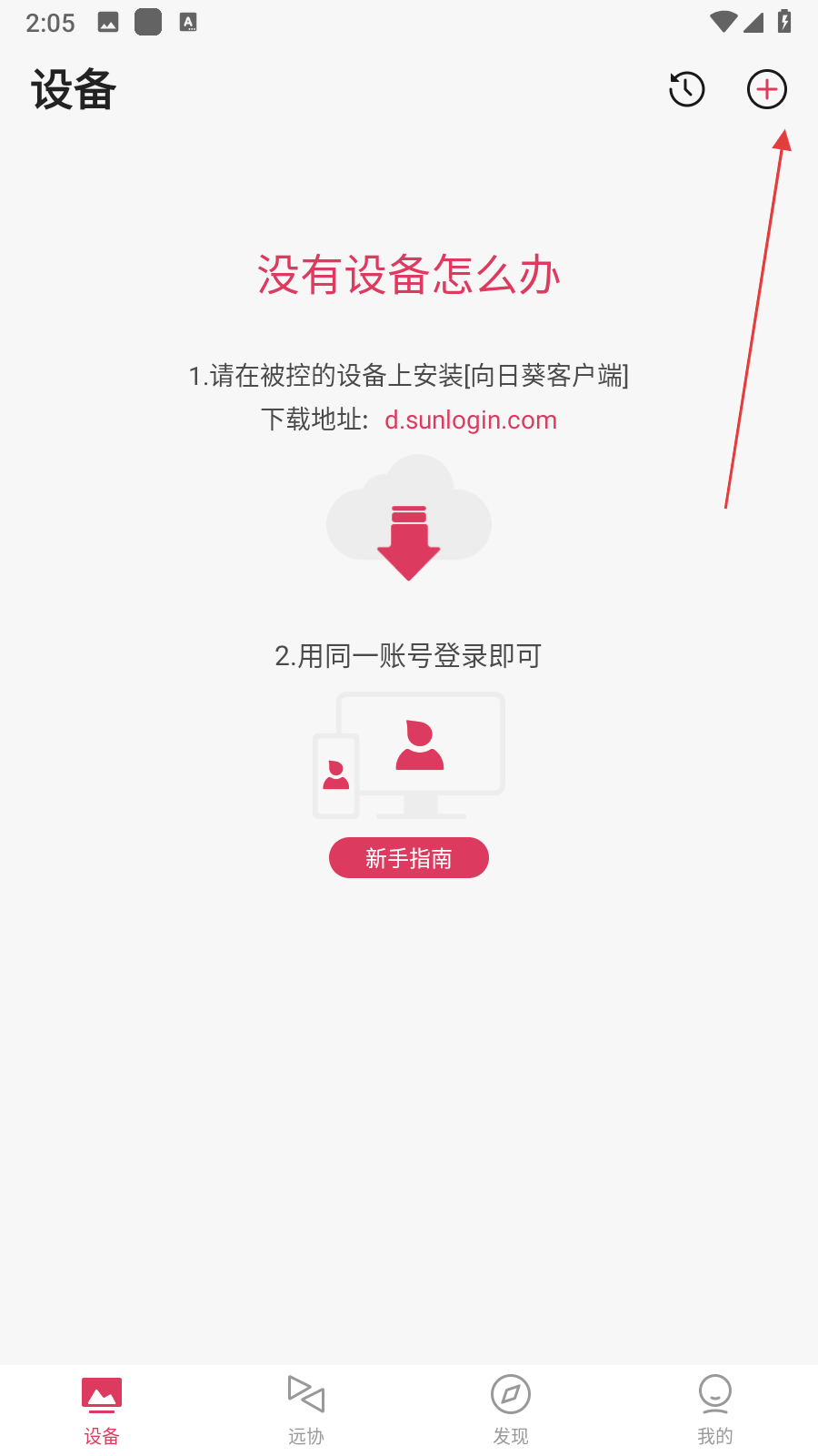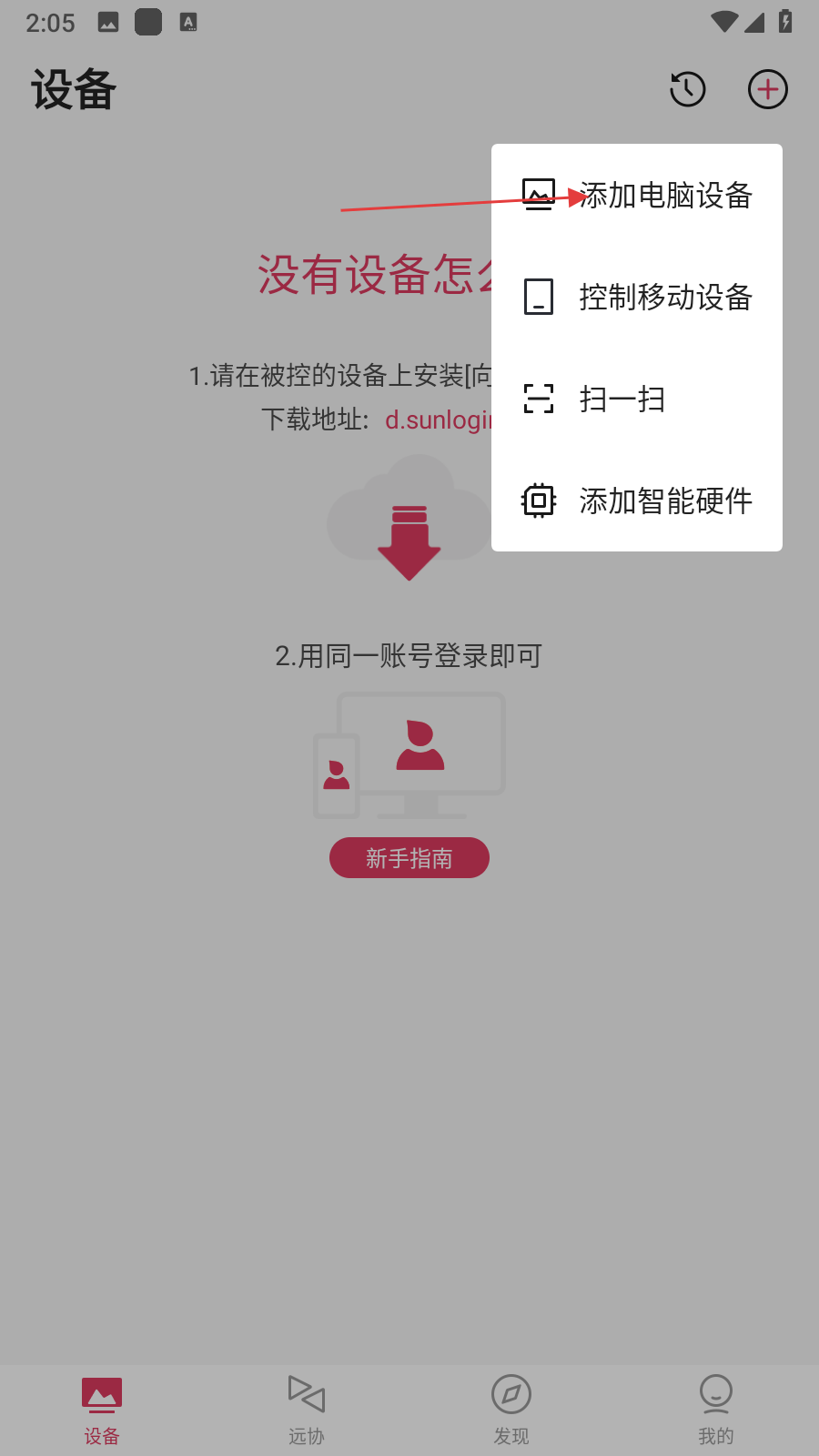 1、打开向日葵远程控制客户端app,进入主界面,点击下方的设备选项。在设备页面,点击右上角的+按钮,打开添加设备菜单。