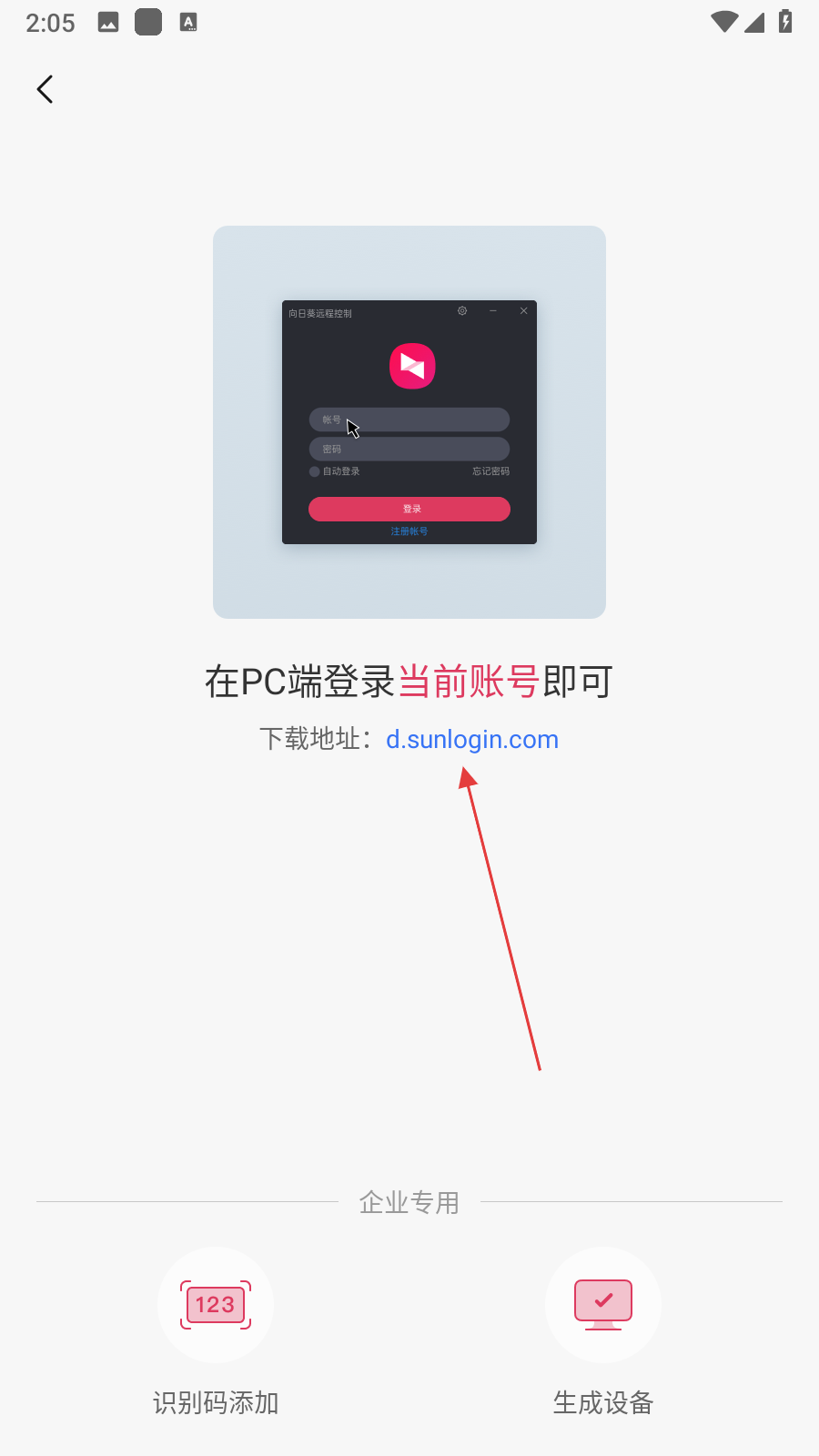 3、如果电脑上已经安装了向日葵客户端,请确保电脑上和手机上登录的账号一致。如果没有安装,您可以点击界面中的下载地址,在电脑上下载并安装客户端,然后登录账户即可完成电脑设备的添加。
