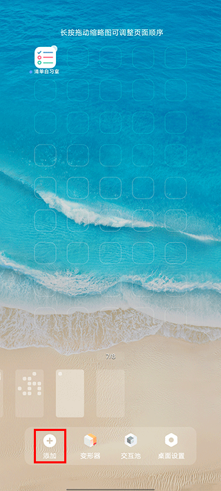 1.用两根手指捏合手机桌面页面或长按桌面空白处,选择【添加】