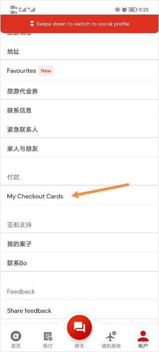 1、在亚航app中文版的账户功能栏中找到支付功能,点击。