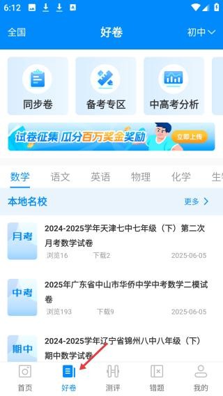 2、点击试卷页面,显示同步试卷等板块,显示多学科试卷,显示浏览下载数据,获取当地名校试卷。