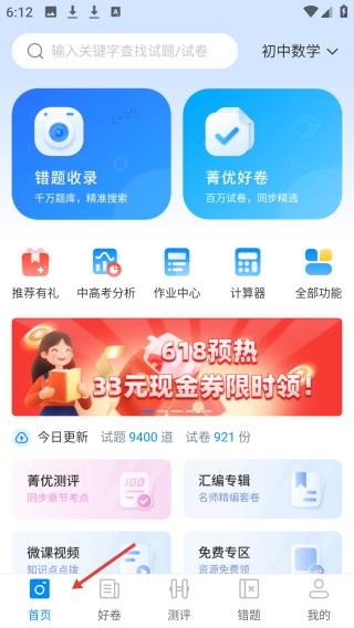 1、点击首页找到搜索栏,包含错题收集等功能,展示618热身活动,以及试题、试卷更新等信息。