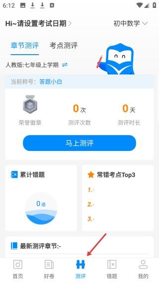 3.点击考核页面可设置考试日期,显示老师版本的章节考核,显示标题、错题等,并查看最新考核章节。
