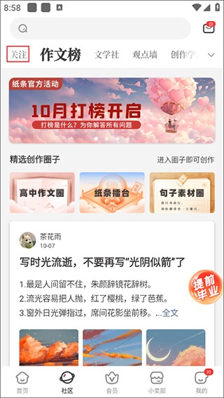 1、点击作文纸条素材电子版主界面顶部“关注”选项;