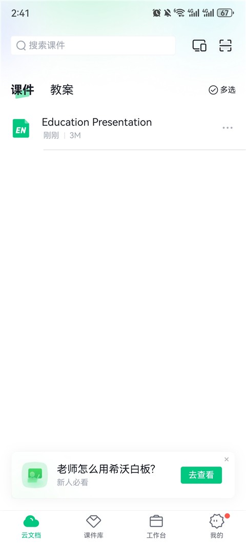 4、希沃白板课件图书馆的用户在教学时可以直接使用软件提供的课件,也可以上传自己的课件。