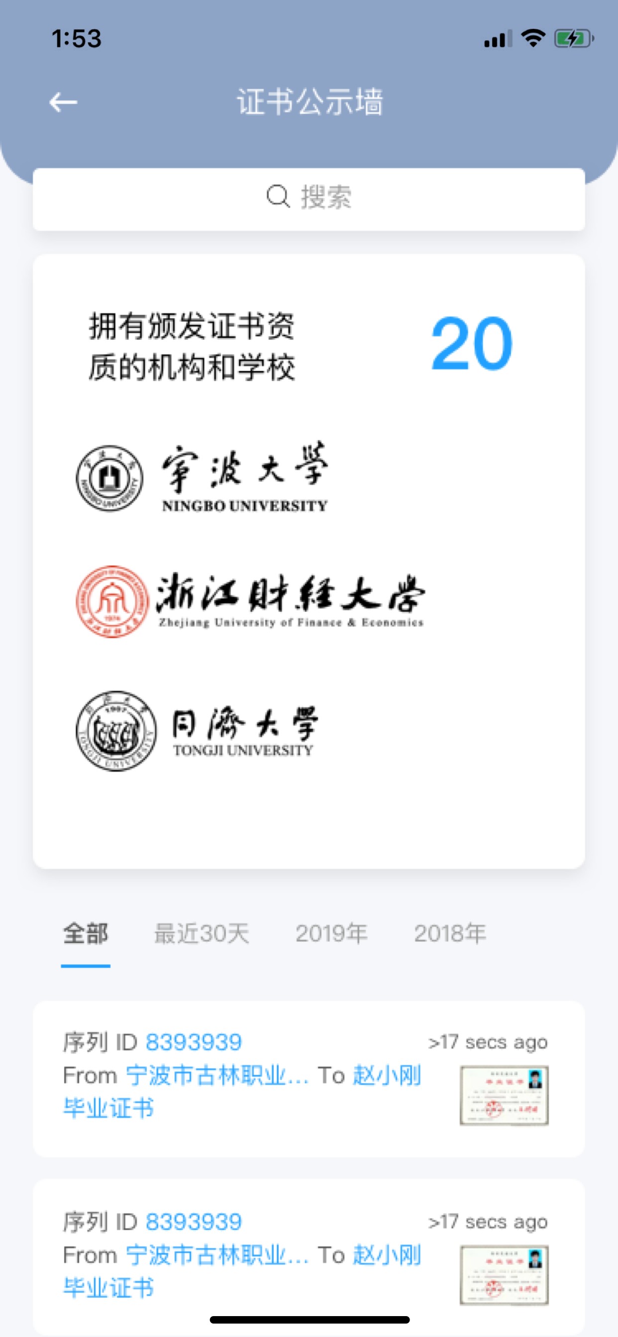 2.证书宝APP,端到端加密颁发给接收证书,防止证书伪装,保证其唯一存在;自动验真和离线验真,可以随时验证真伪;证书、凭证、票证和其他类型